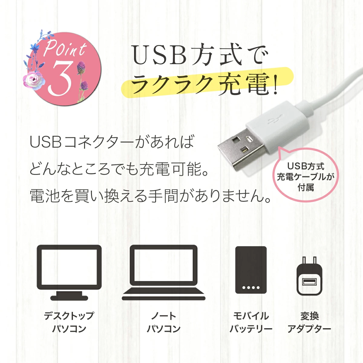 ・充電はUSB方式。電池の購入の必要ナシ♪
