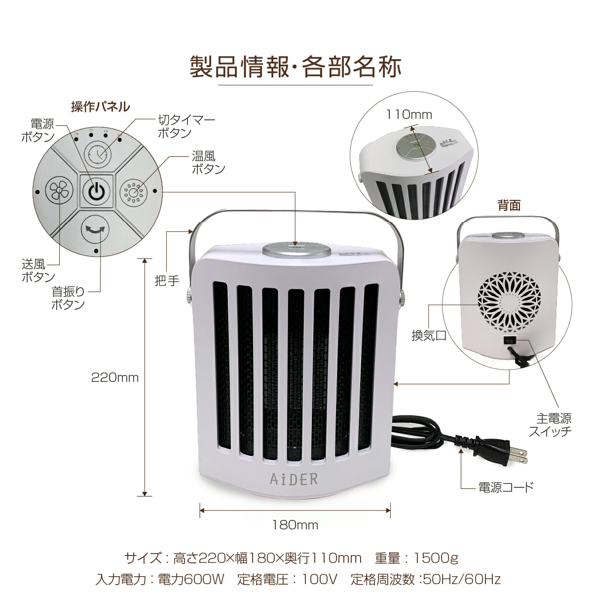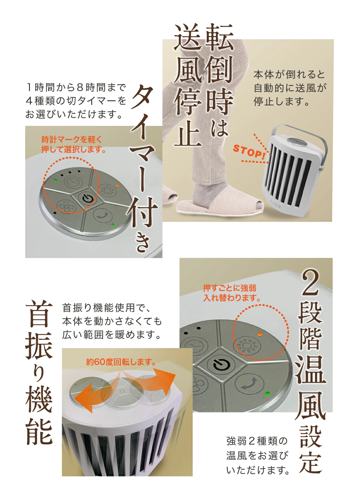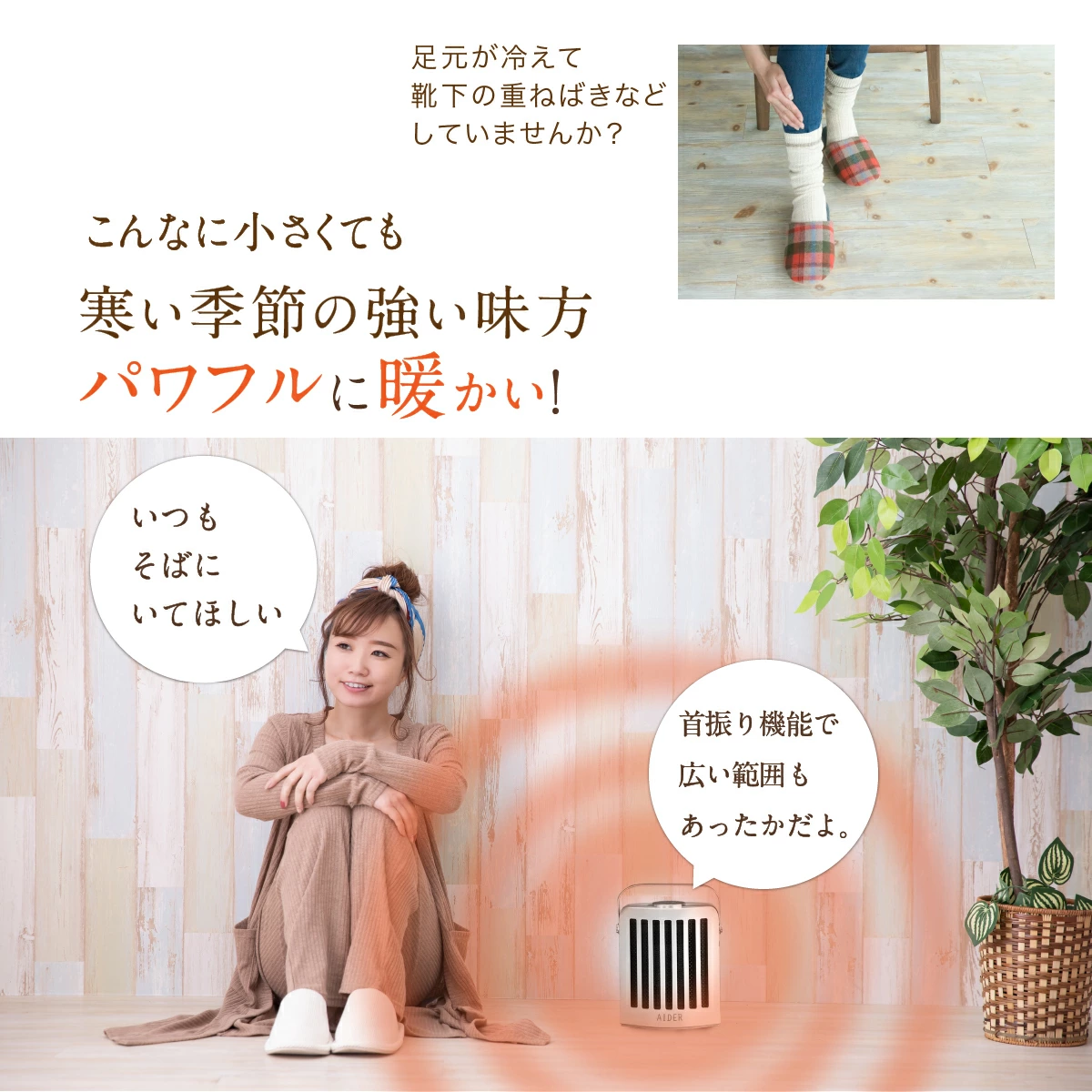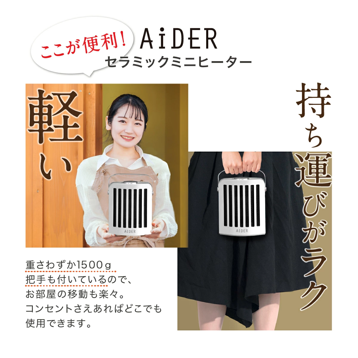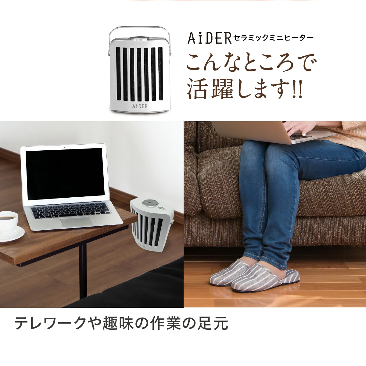 AIDERセラミックミニヒーターは、特殊加工されたセラミックスを電気で発熱させ、