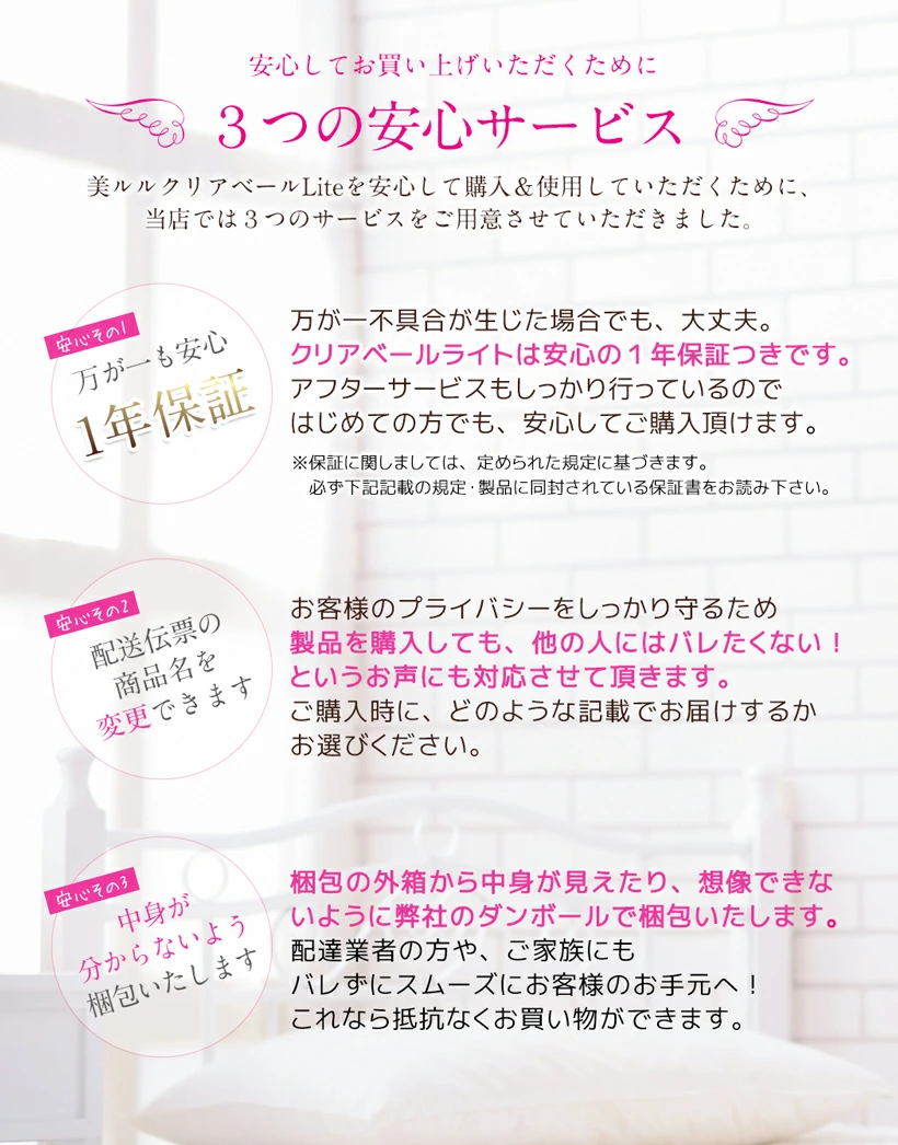 belulu クリアベールライトを正しく・安全にご使用いただくために以下の規約をよくお読みのうえご購入ください。