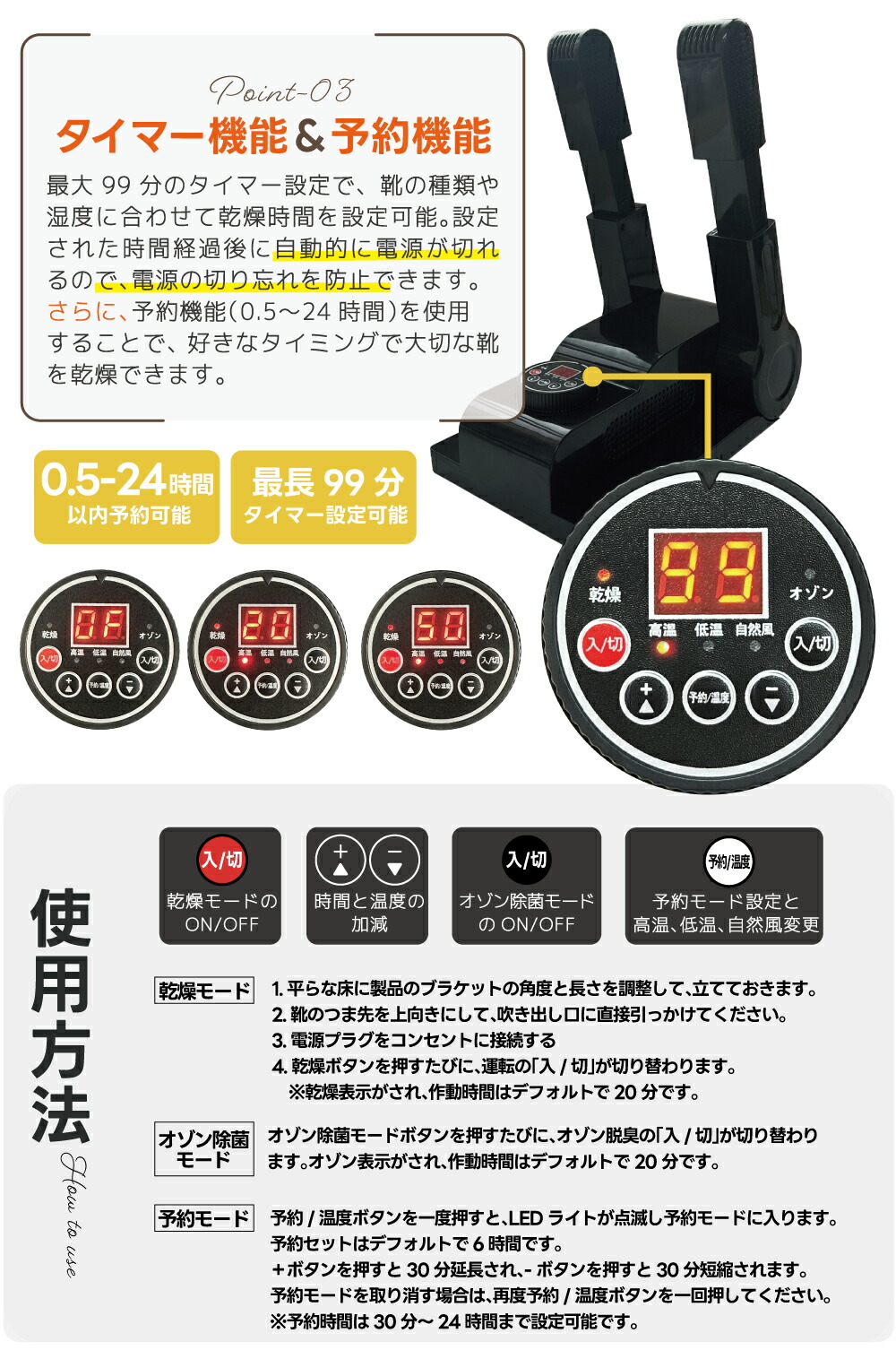 さらに、予約機能(0.5~24時間)を使用することで、好きなタイミングで大切な靴を乾燥できます。