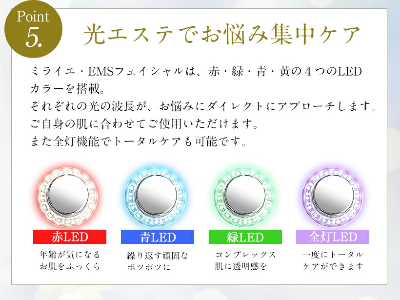 赤、青、緑色の3つのLEDライトを搭載し、それぞれお悩みにダイレクトにアプローチ。