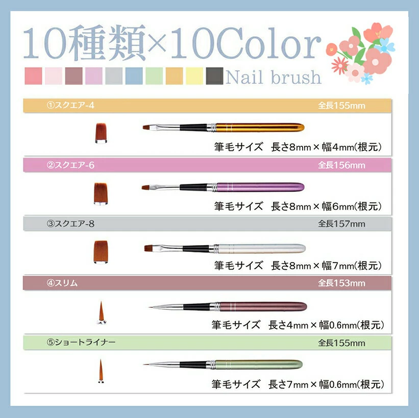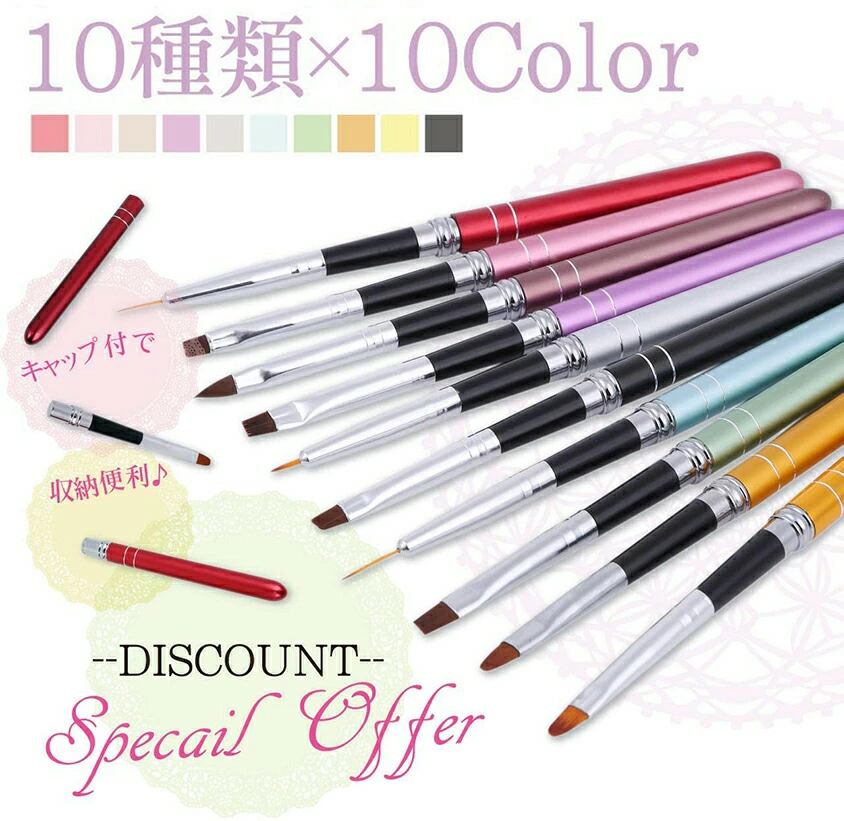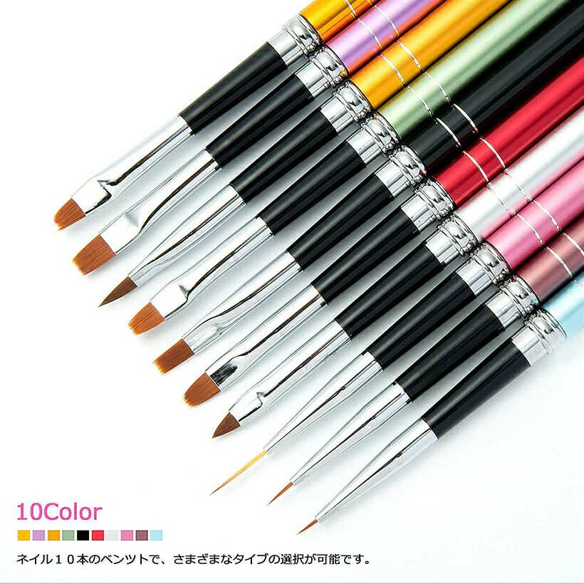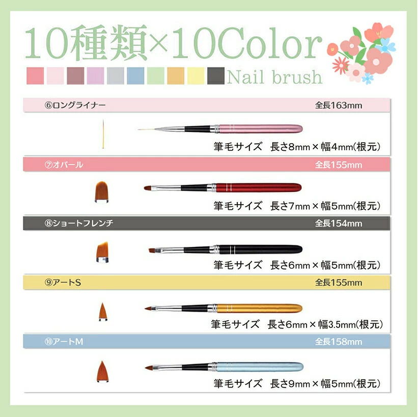 これからジェルネイルを始める人におすすめの、ジェルネイルブラシ10本セットです。 それぞれの種類に役割や描き方のコツがあるので、練習用として使うのに最適。自分の爪に合う細やかなブラシ選びがしたい人にもおすすめです。