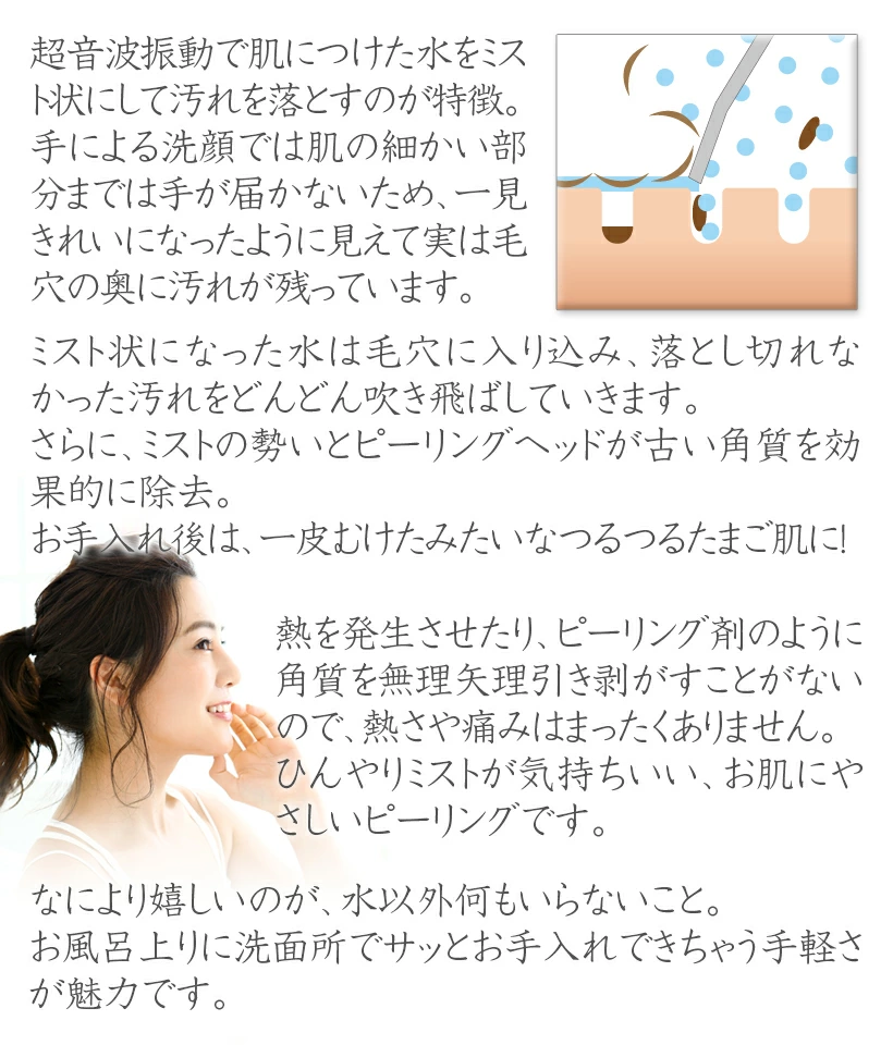 音波振動で水をミスト状にして、毛穴の汚れを吹き飛ばして落とします。