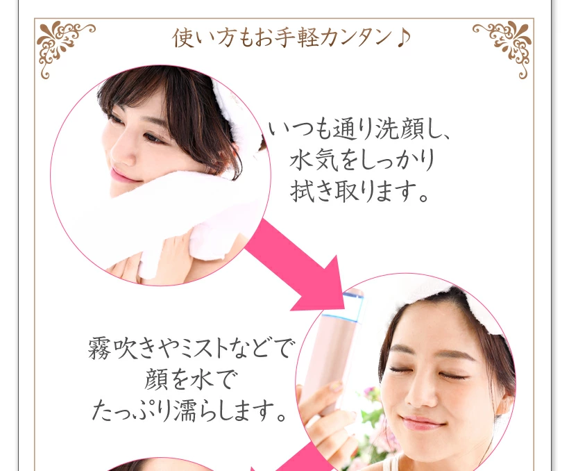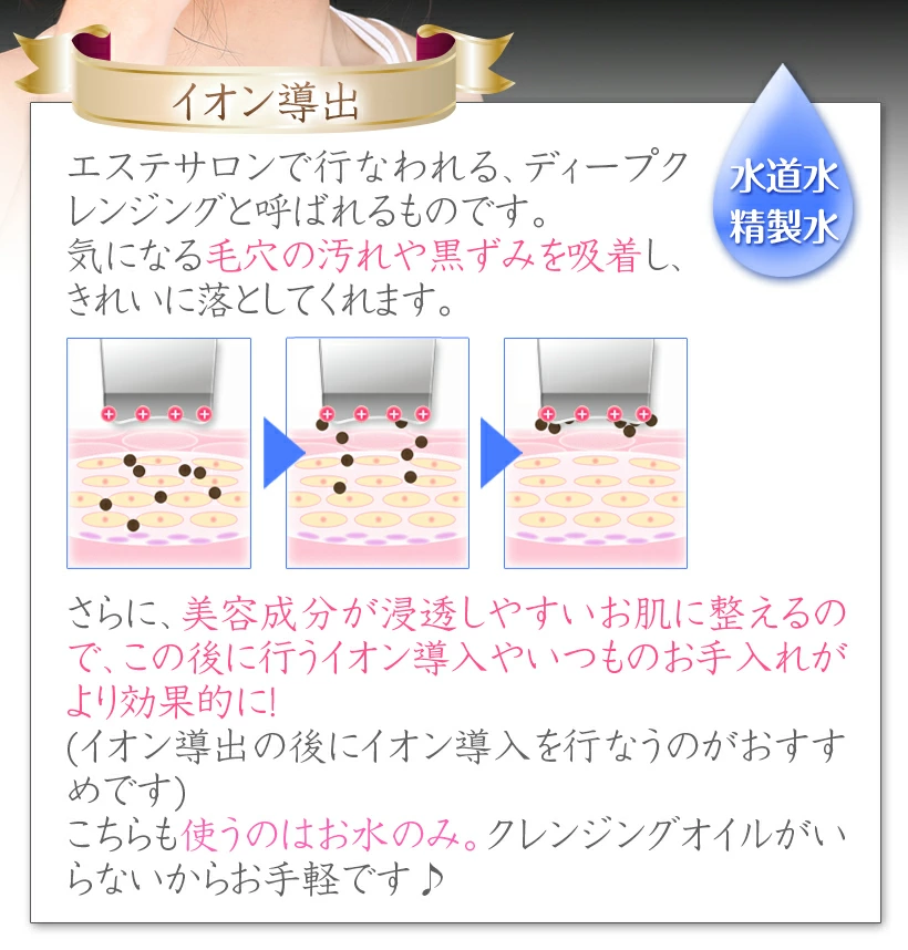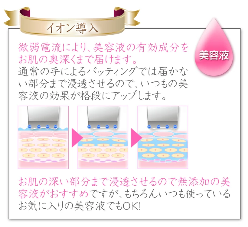 イオンの力で美容液や化粧水をお肌に浸透させます。